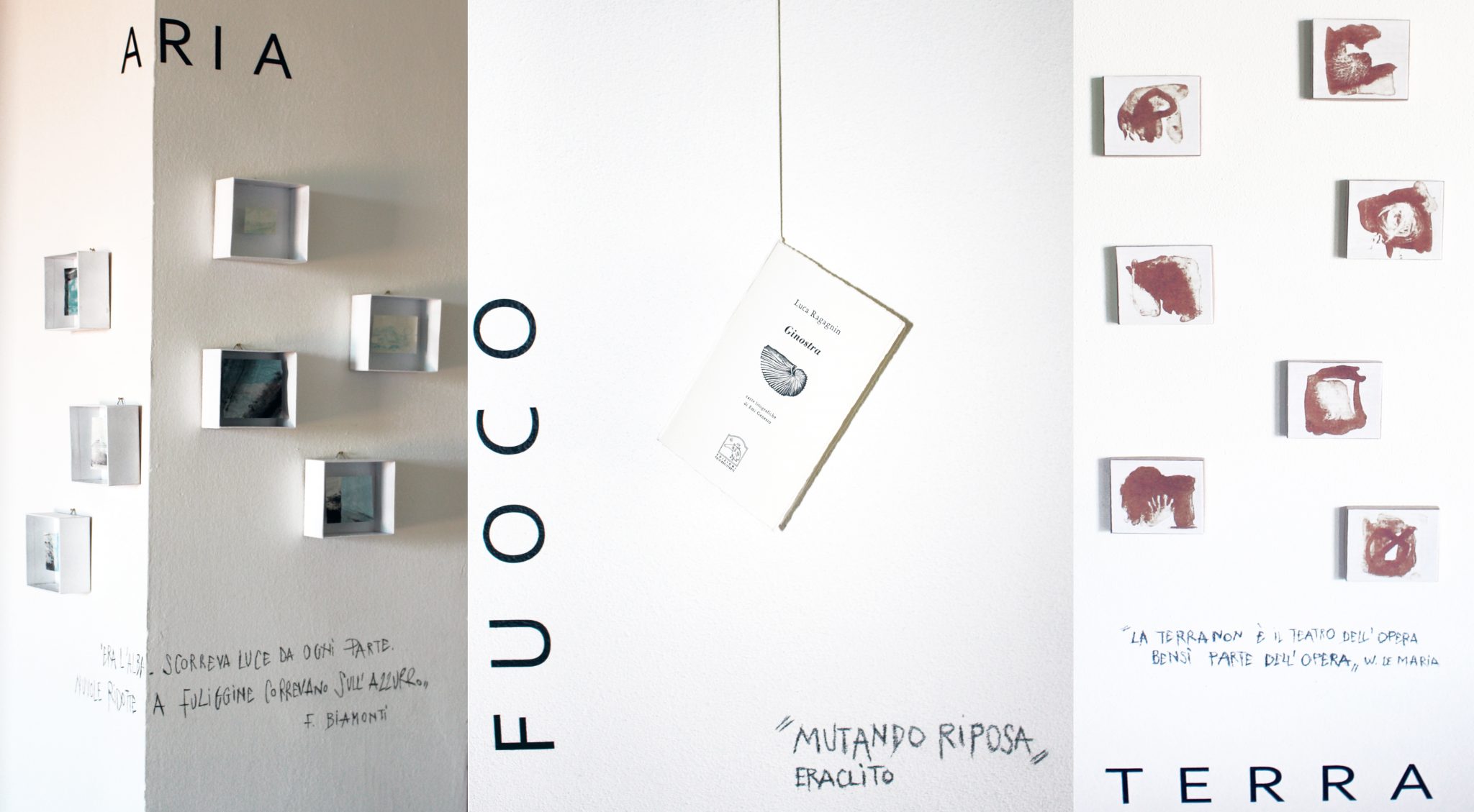Salendo, si giunge all’elemento aria: sette contenitori cubici da cui emergono foglietti leggeri solcati da segni azzurri, bianchi e neri insieme ad una frase estrapolata dal romanzo Attesa sul mare di Francesco Biamonti.